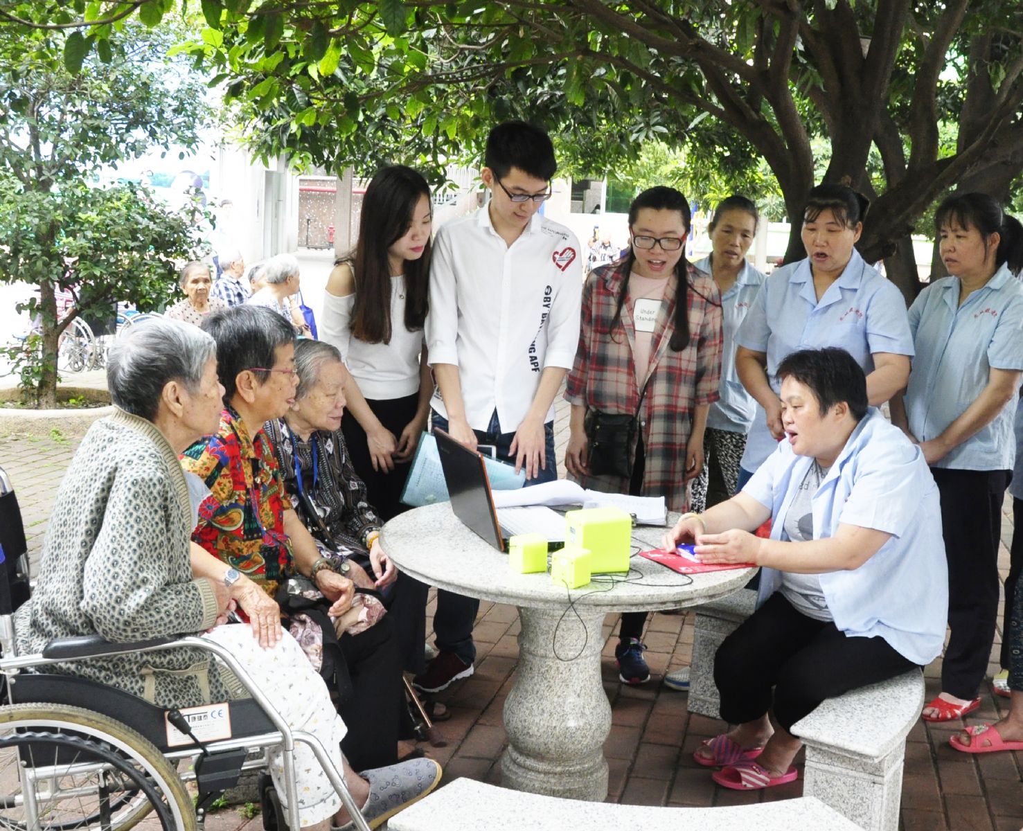在互動中,老人笑彎了眼邊的皺紋。